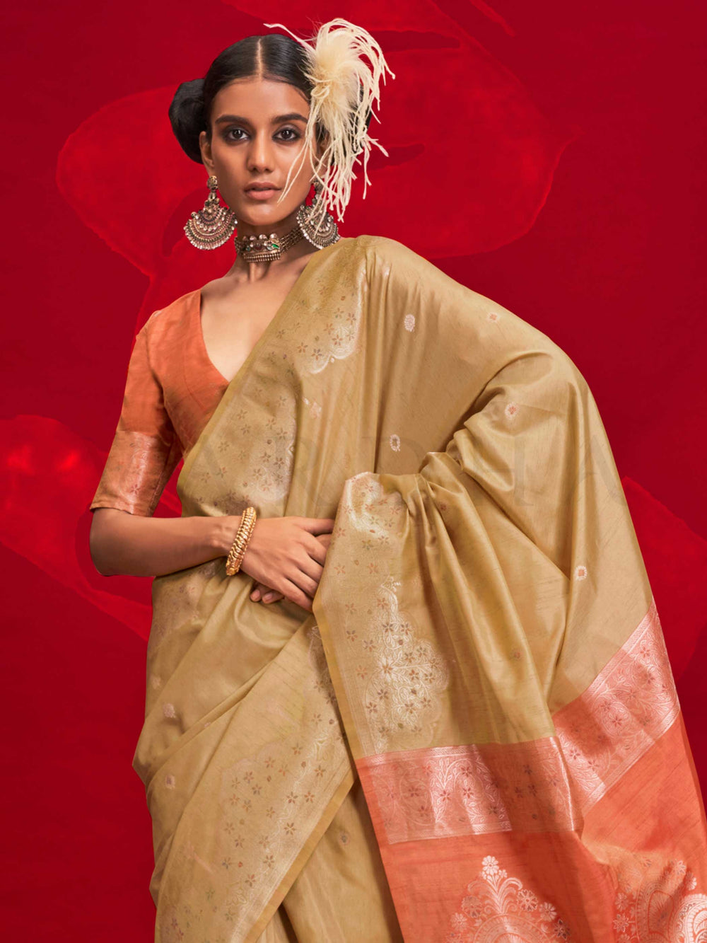 Beige Tussar Silk Handloom Saree with Gold Zari Pallu