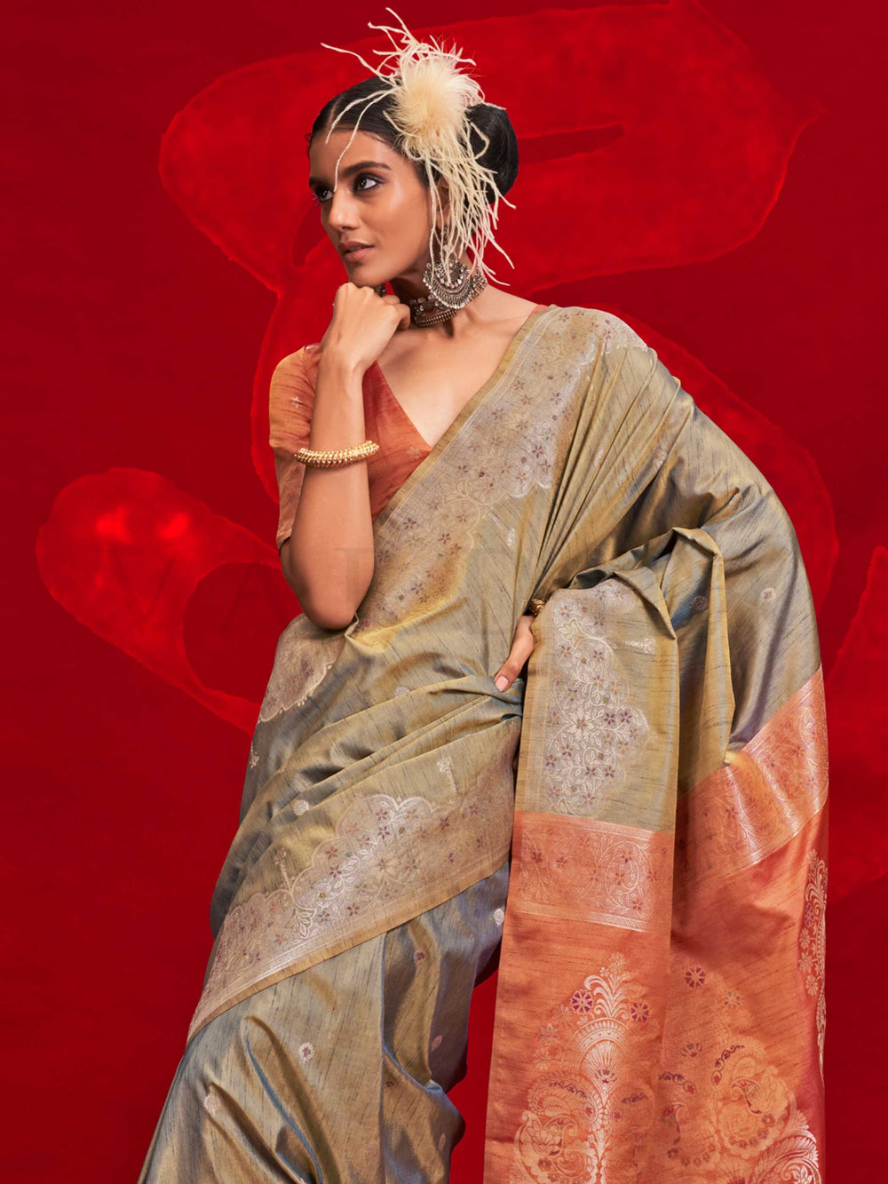 Steel Grey Tussar Silk Handloom Saree with Gold Zari Pallu