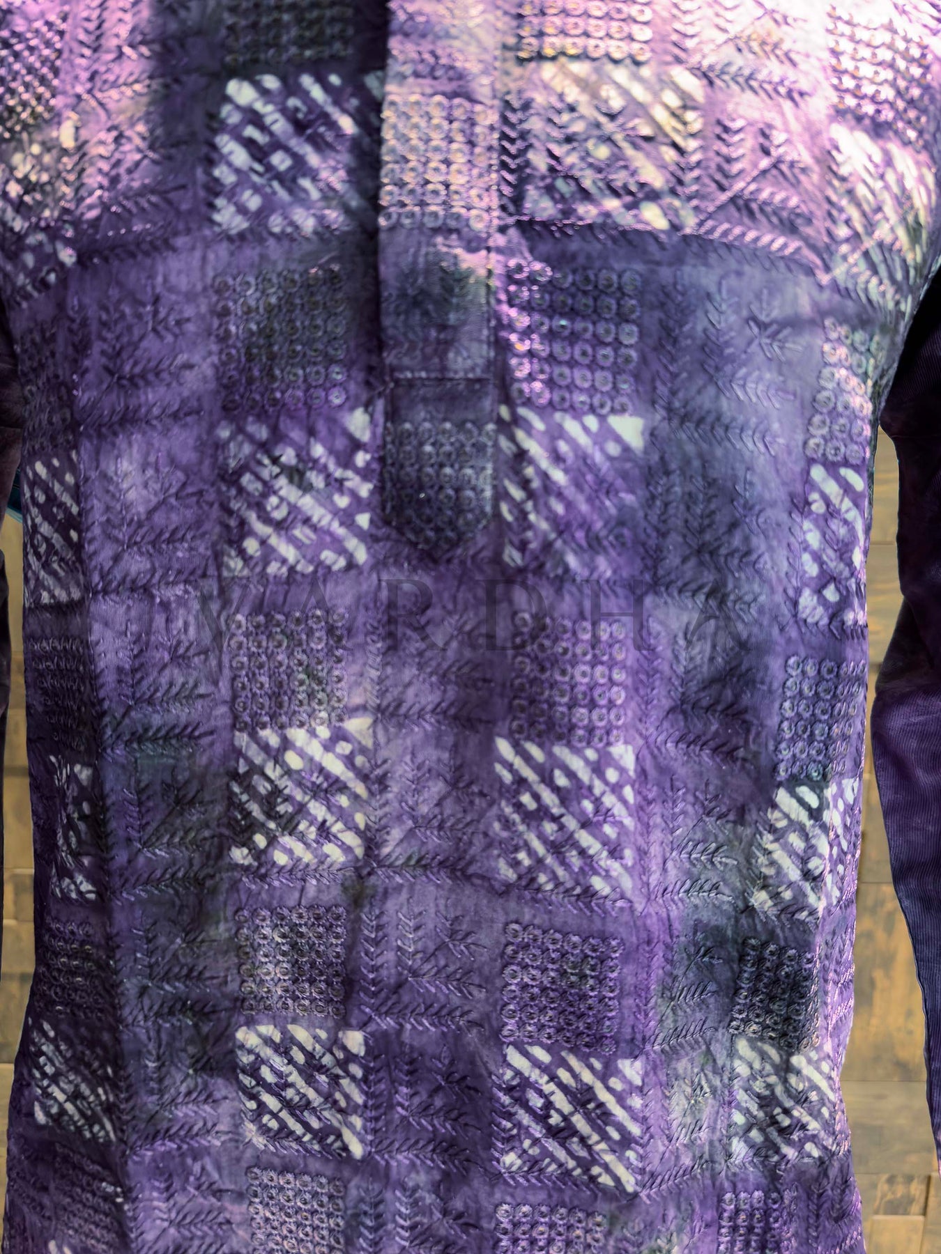 Presenting a captivating men’s kurta crafted from luxurious Viscose Chanderi, this piece is a masterpiece of texture and color. It features a modern Shibori (Tie-Dye) base in vibrant shades of purple, overlaid with intricate thread embroidery and shimmering sequins. The lush fabric offers a subtle sheen and a comfortable drape, making it an excellent choice for evening parties, Sangeet ceremonies, and festive celebrations where you want to shine.