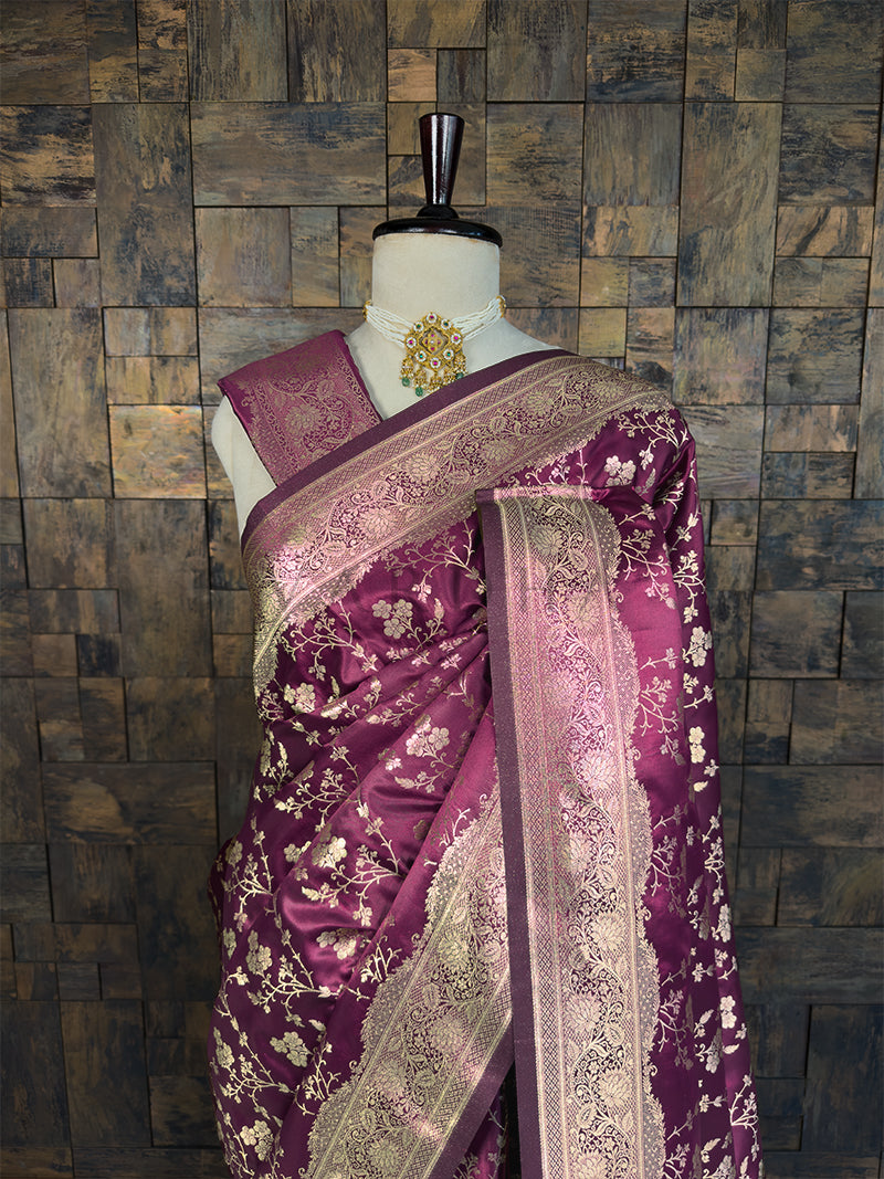 Wine Banarasi Satin Silk Saree with Gold Zari