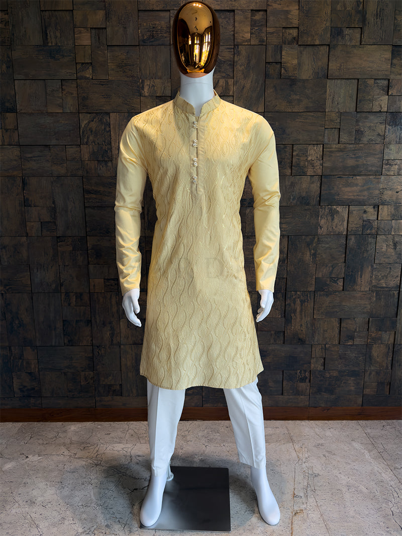 The kurta features the exclusive all-over embroidery pattern of interlocking wavy vines. The design is stitched in self-tone yellow threads and highlighted with shimmering sequins, creating a textured surface that glistens gently under the light.