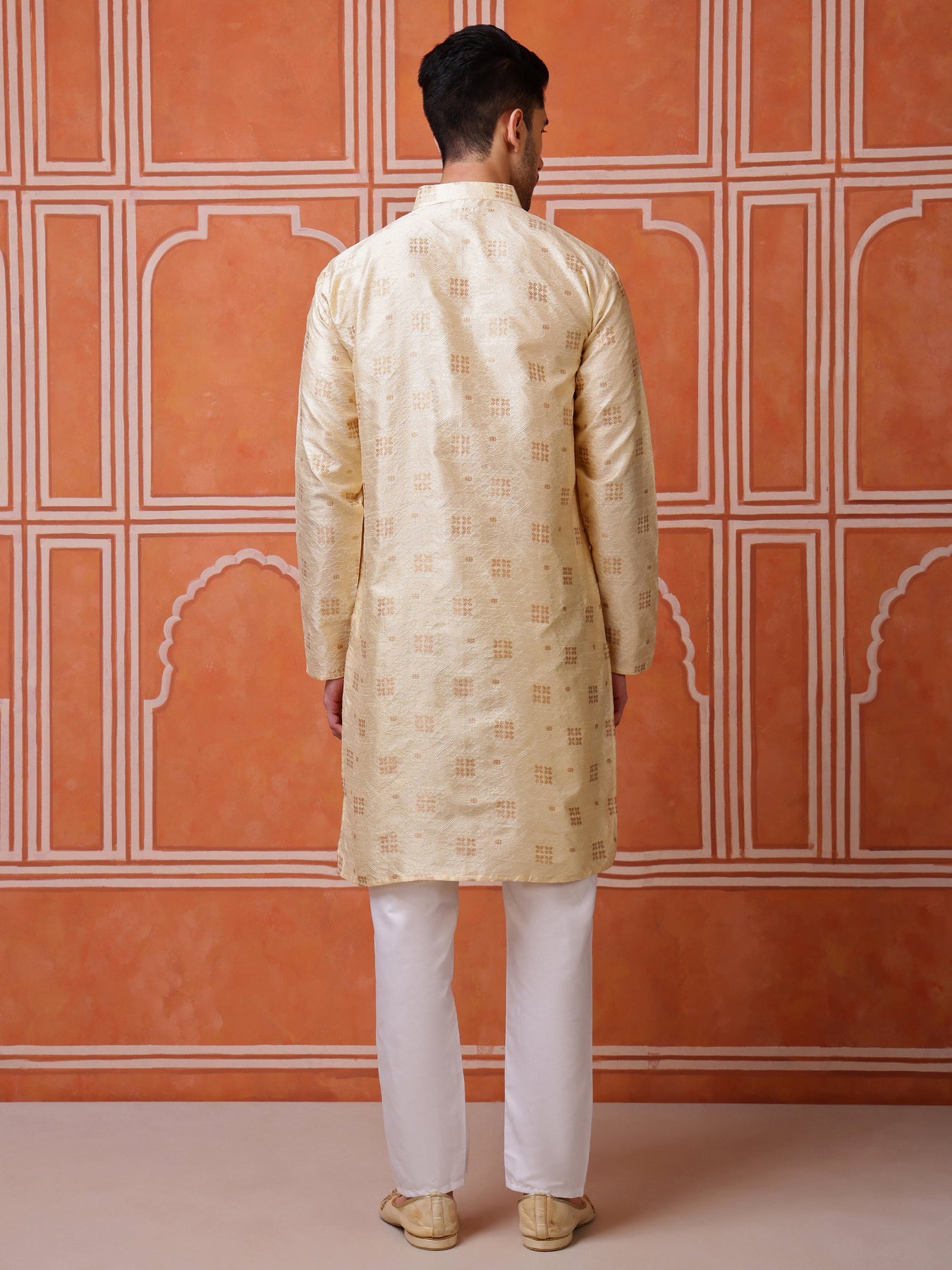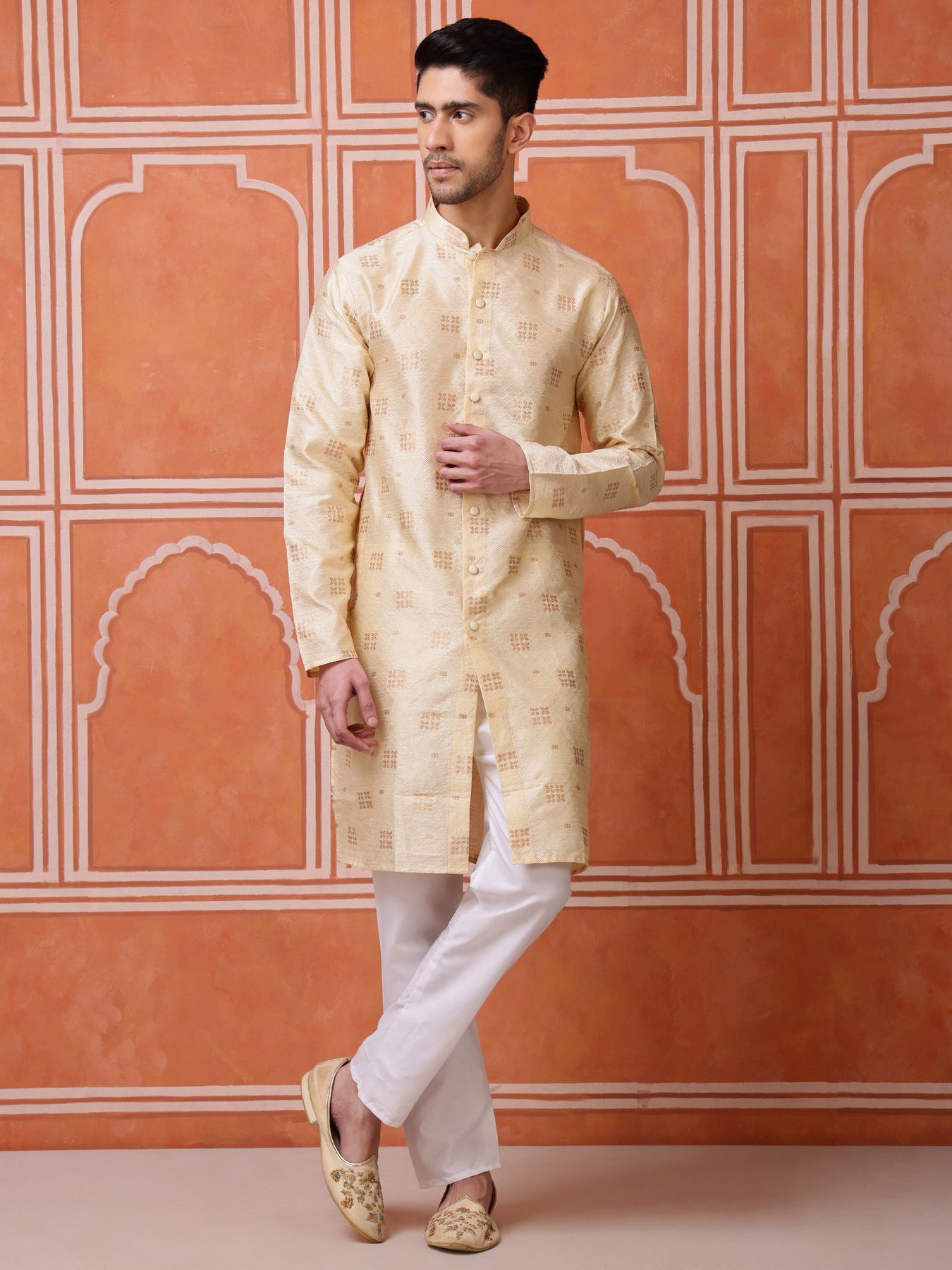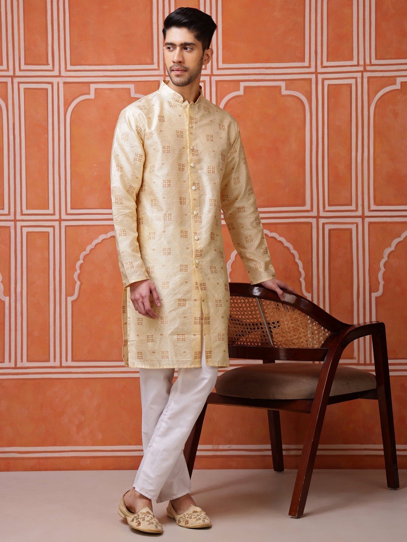 A sophisticated men’s kurta crafted from a lustrous silk blend, this piece features elegant, spaced-out floral buti motifs woven directly into the fabric. The timeless Beige color, complemented by subtle goldish-brown motifs, exudes understated luxury. Designed with a modern concealed placket for a seamless look, this kurta is an excellent choice for formal gatherings, festive occasions, and wedding events.