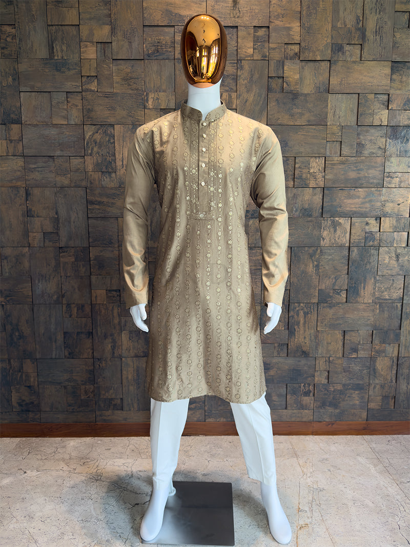 Exude understated luxury with this Coffee Brown Sequin Kurta. A masterclass in earthy elegance, this piece is tailored from premium Viscose fabric that offers a rich, metallic bronze sheen.