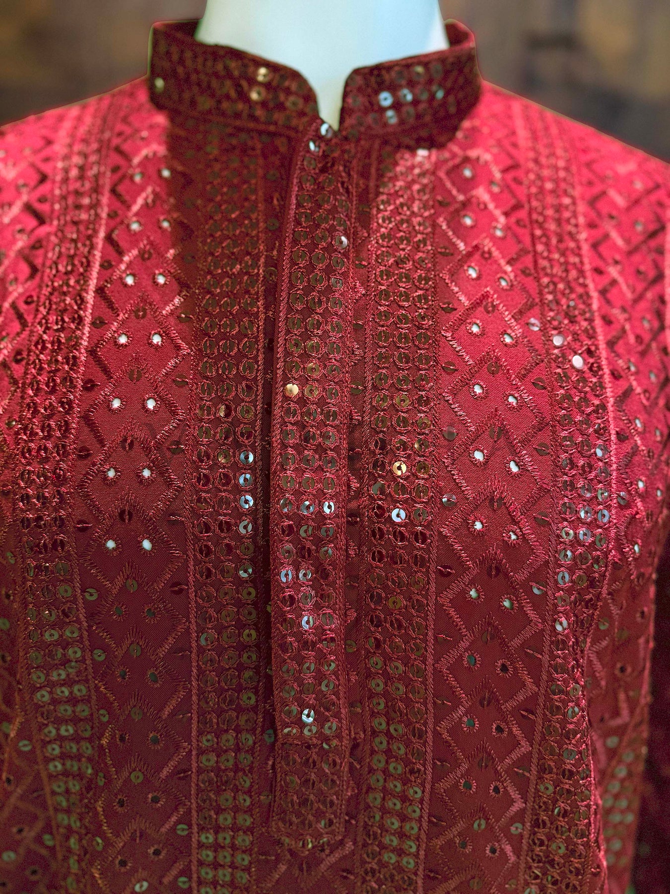 Crafted for grand celebrations, this garnet red viscose kurta pairs a luxurious jacquard base with dense sequin embroidery laid out in vertical panels. The tonal geometric textures and mirror-like sequins create a dignified sparkle that reads rich in photographs and evening light. A sharp mandarin collar edged with sequins and a concealed placket keep the silhouette clean and modern, while full sleeves balance the ornate surface. The viscose fabric feels smooth with a gentle sheen and fluid drape, keeping you comfortable from rituals to the dance floor. Style with ivory churidar for classic elegance or with tapered trousers and loafers for an Indo-contemporary finish.