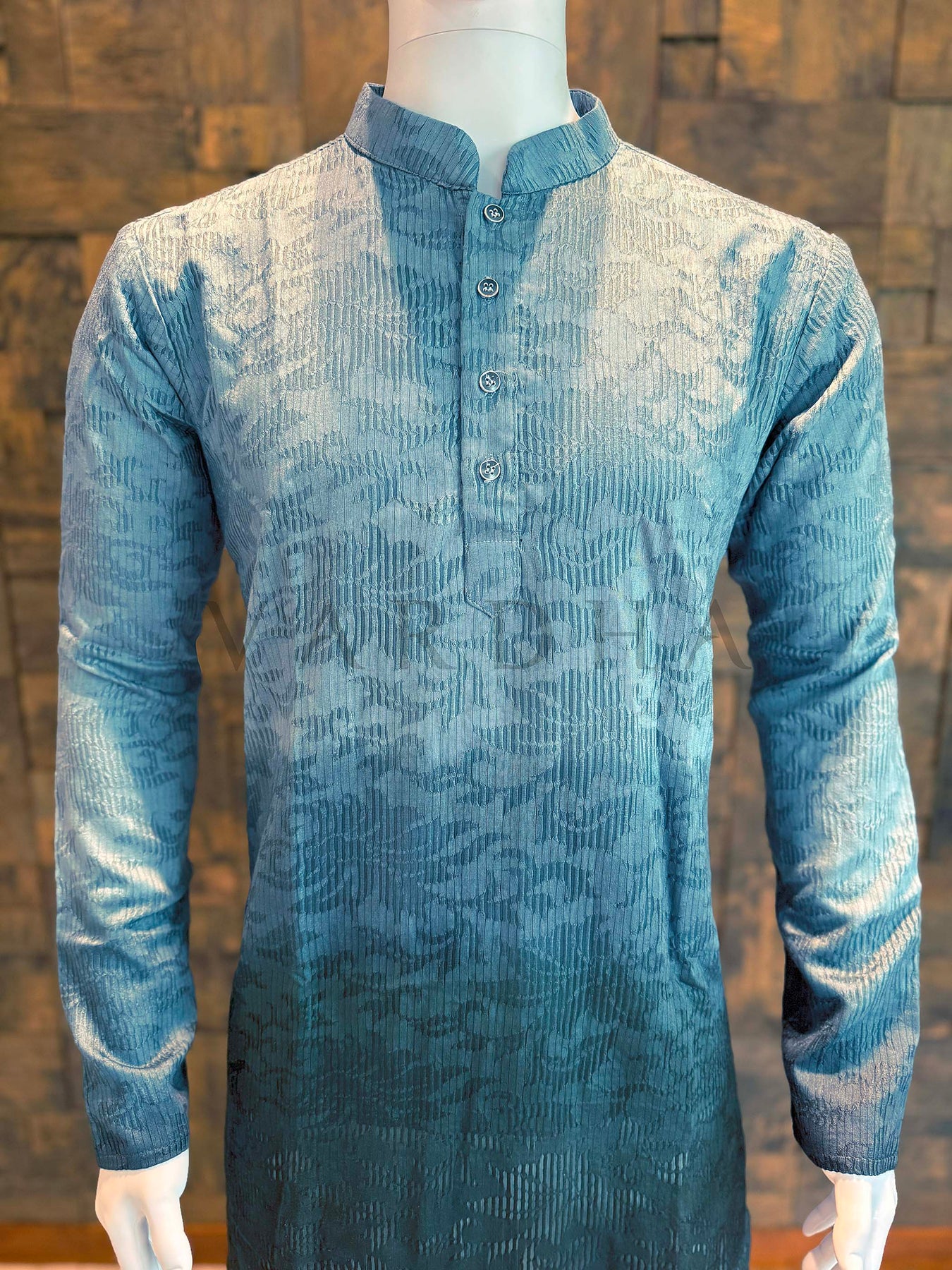 Understated yet striking, this teal ombre viscose kurta moves from a cool aqua tone at the shoulders to a deep charcoal grey at the hem, creating a slimming, photo-friendly gradient. The surface is enriched with a self-textured jacquard that mixes fine vertical ribs with cloudy motifs, adding quiet depth instead of bling. A neat mandarin collar, clean button placket and full sleeves complete the modern, tailored look. The viscose base feels smooth with a gentle sheen and fluid drape comfortable for long celebrations and elegant enough for evening functions. Pair with ivory churidar or tapered trousers for a refined festive ensemble that stands out without shouting.