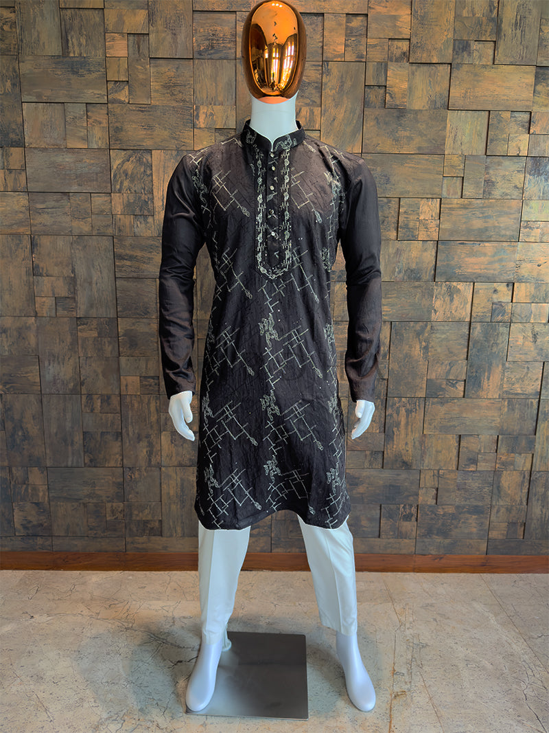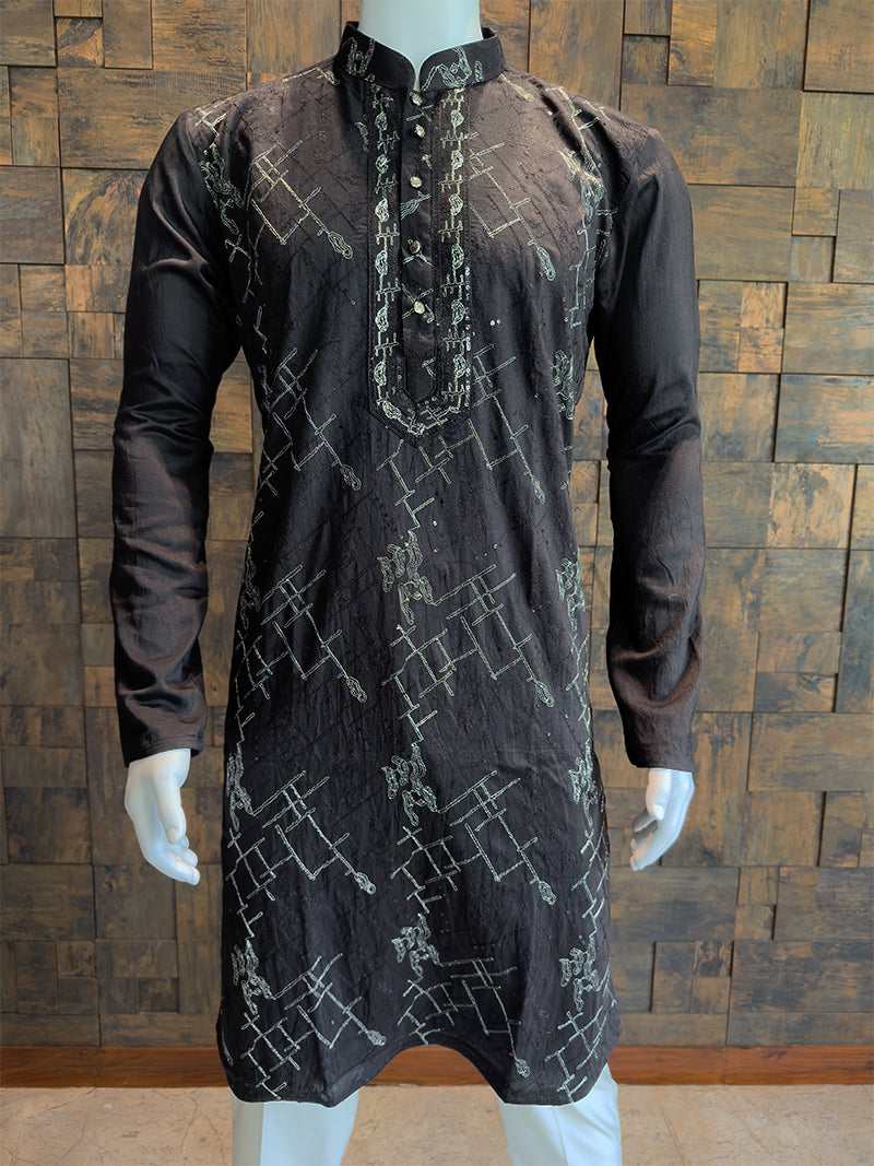 Redefine evening luxury with this Jet Black Sequin Kurta. Designed for the modern man who prefers edgy sophistication over traditional florals, this piece is tailored from premium Viscose fabric that offers a superior drape and rich black sheen.