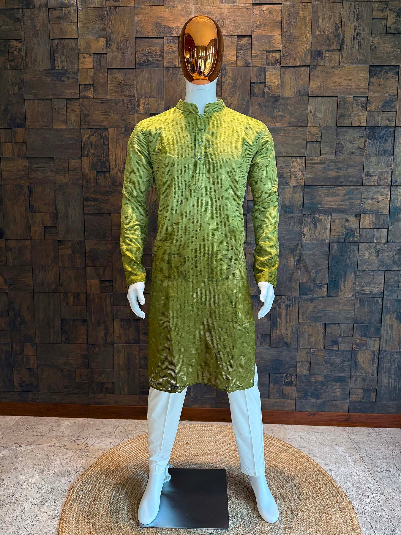 Celebrate in confident color with this lime green ombre viscose kurta. The fabric graduates from a fresh citrus hue at the shoulders to a deeper olive at the hem, creating a slimming, photo-friendly effect. A refined self-textured jacquard adds depth through vertical ribs and abstract tonal motifs luxurious to the eye yet light on the body. Finished with a crisp mandarin collar, neat four-button placket, and full sleeves, the silhouette is modern, minimal, and undeniably festive. The viscose base delivers a smooth hand feel, gentle sheen, and airy drape for ceremonies that run from morning rituals to evening receptions. Pair with ivory churidar or tapered trousers to let the gradient and texture take center stage.