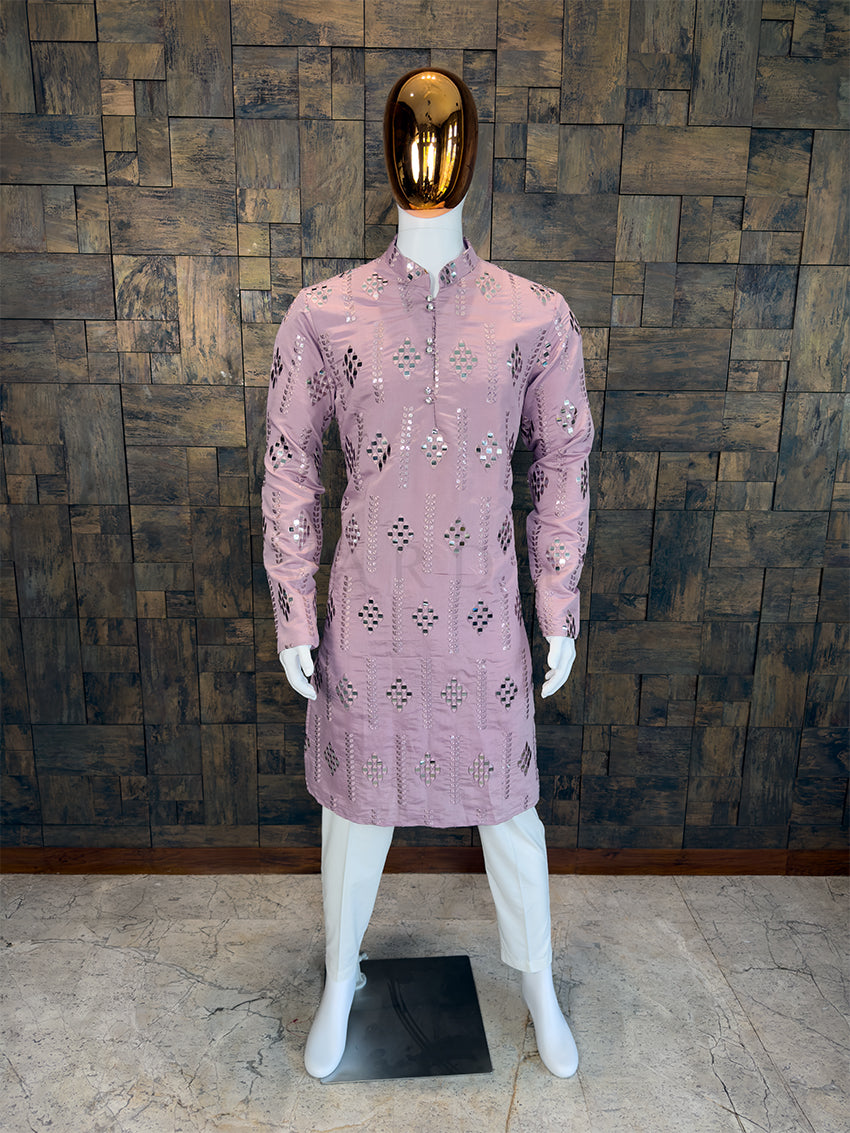 Step into the festive spotlight with this Mauve Designer Foil Mirror Work Kurta. Designed for the modern gentleman who loves to blend contemporary pastel hues with high-shine traditional craftsmanship.