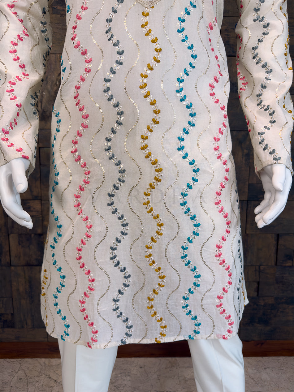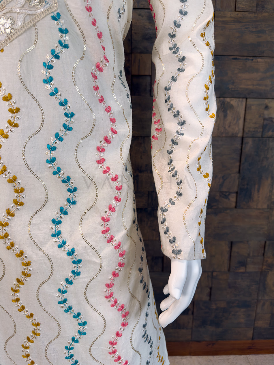 The kurta features a rhythmic all-over wavy embroidery pattern, adorned with delicate leaf motifs in vibrant shades of Pink, Teal Blue, and Mustard Yellow. The design is highlighted by fine lines of silver sequins, adding a daytime sparkle that catches the sunlight.