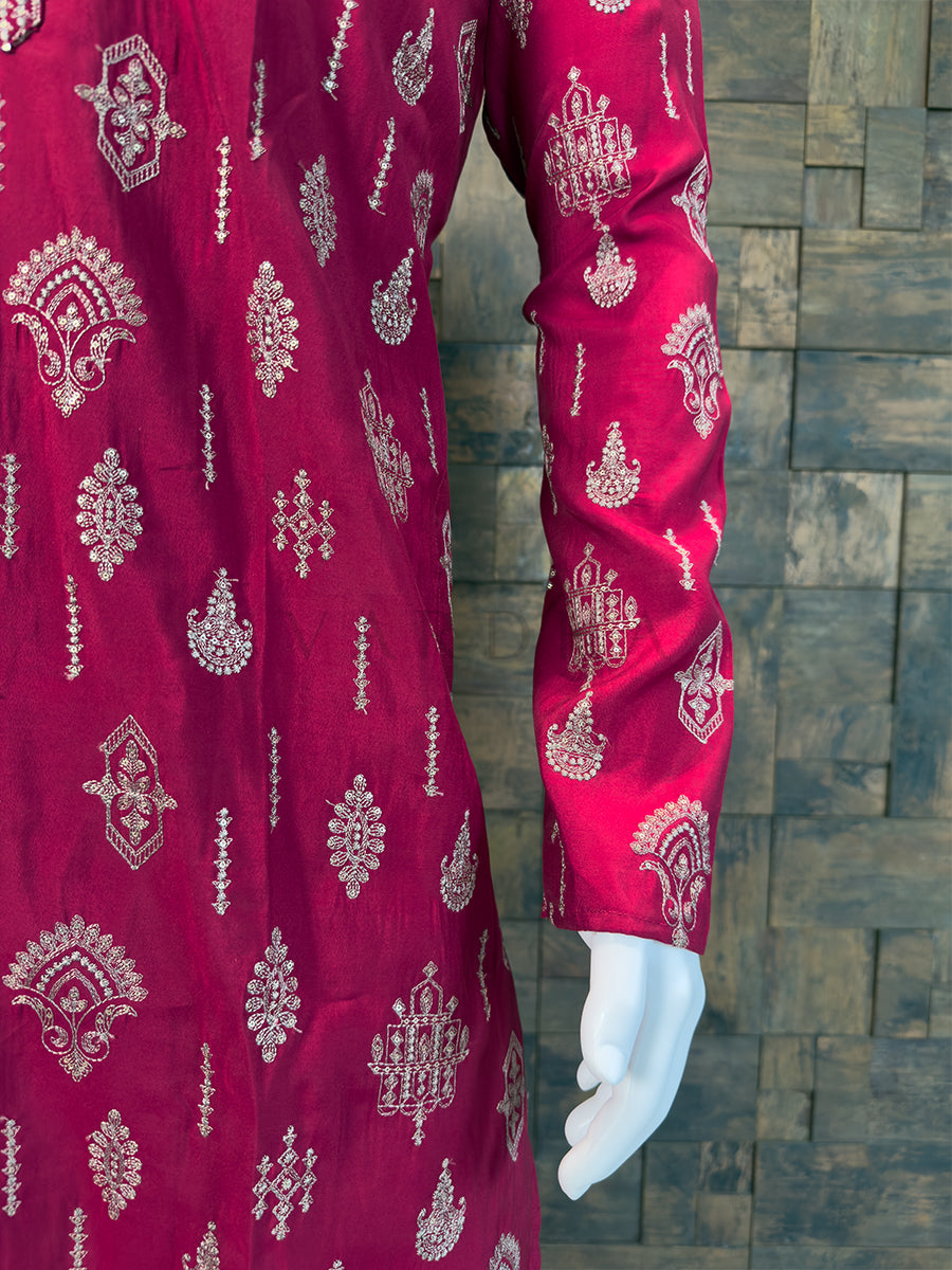Make a bold and royal statement with this Rani Pink Art Silk Designer Kurta. Crafted for the man who isn't afraid of vibrant colors, this piece captures the essence of Indian festivity.