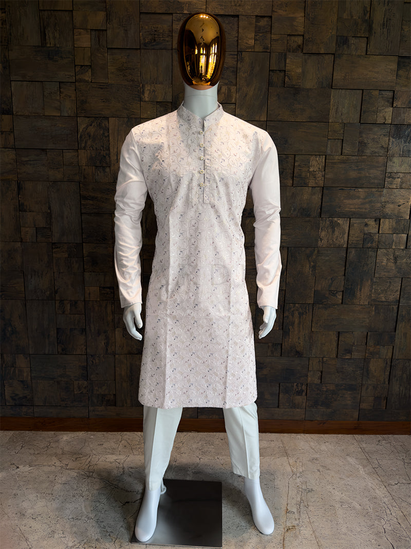 The kurta features the exquisite Multi-Color Embroidery, where delicate floral vines are stitched in soft Pastel Blue and Gold threads. This subtle contrast adds depth to the pristine white base. Embedded sequins catch the light gently, providing a refined shimmer suitable for both day and evening events.
