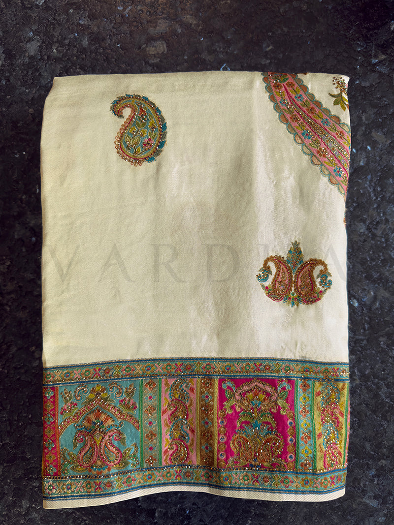 Cream Viscose Silk Saree | Kashmiri Jamawar with Zarkan Work