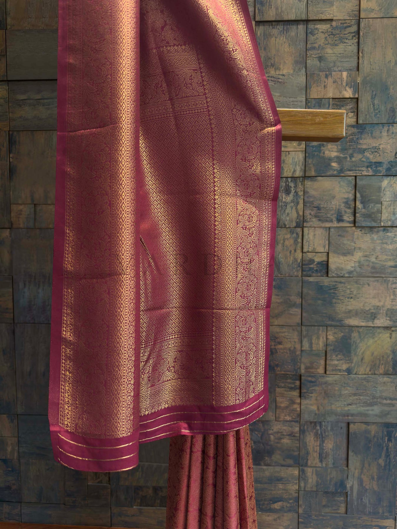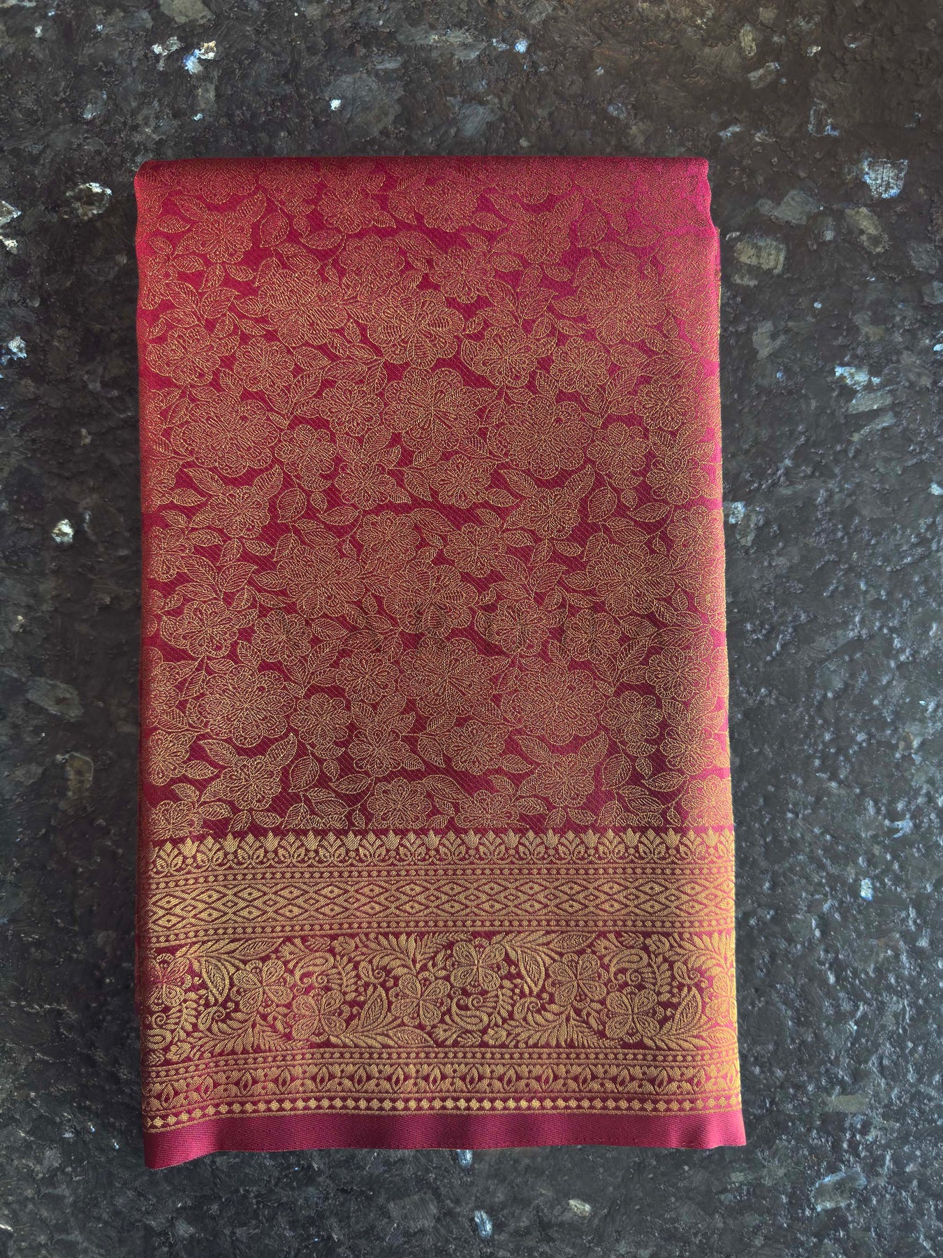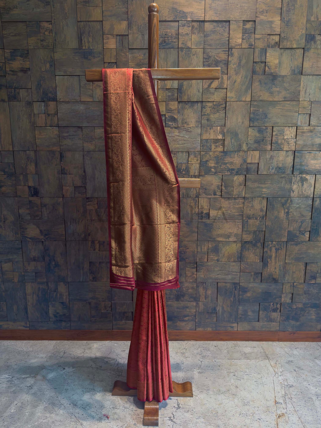 Immerse yourself in royal elegance with this Maroon Golden Zari Kanjivaram Silk Saree, crafted in luxurious art silk with a rich, glossy finish. The deep maroon base is beautifully illuminated with intricate golden zari weaving, giving the saree a sophisticated, heritage appeal ideal for grand traditional occasions. The body features an all-over floral jaal pattern, where delicate blossoms and leafy vines are woven in shimmering gold, creating a dense, opulent texture. The borders are richly detailed with layered floral vines, traditional motifs, and fine geometric bands, framing the drape with a stately finish. The pallu continues the grandeur with elaborately woven zari work that flows seamlessly from body to end, ensuring a striking presence from every angle. Paired with a matching maroon blouse piece featuring golden floral buttas and a coordinated zari border, this saree is designed for women who appreciate timeless Kanjivaram aesthetics with a refined, royal colour story.