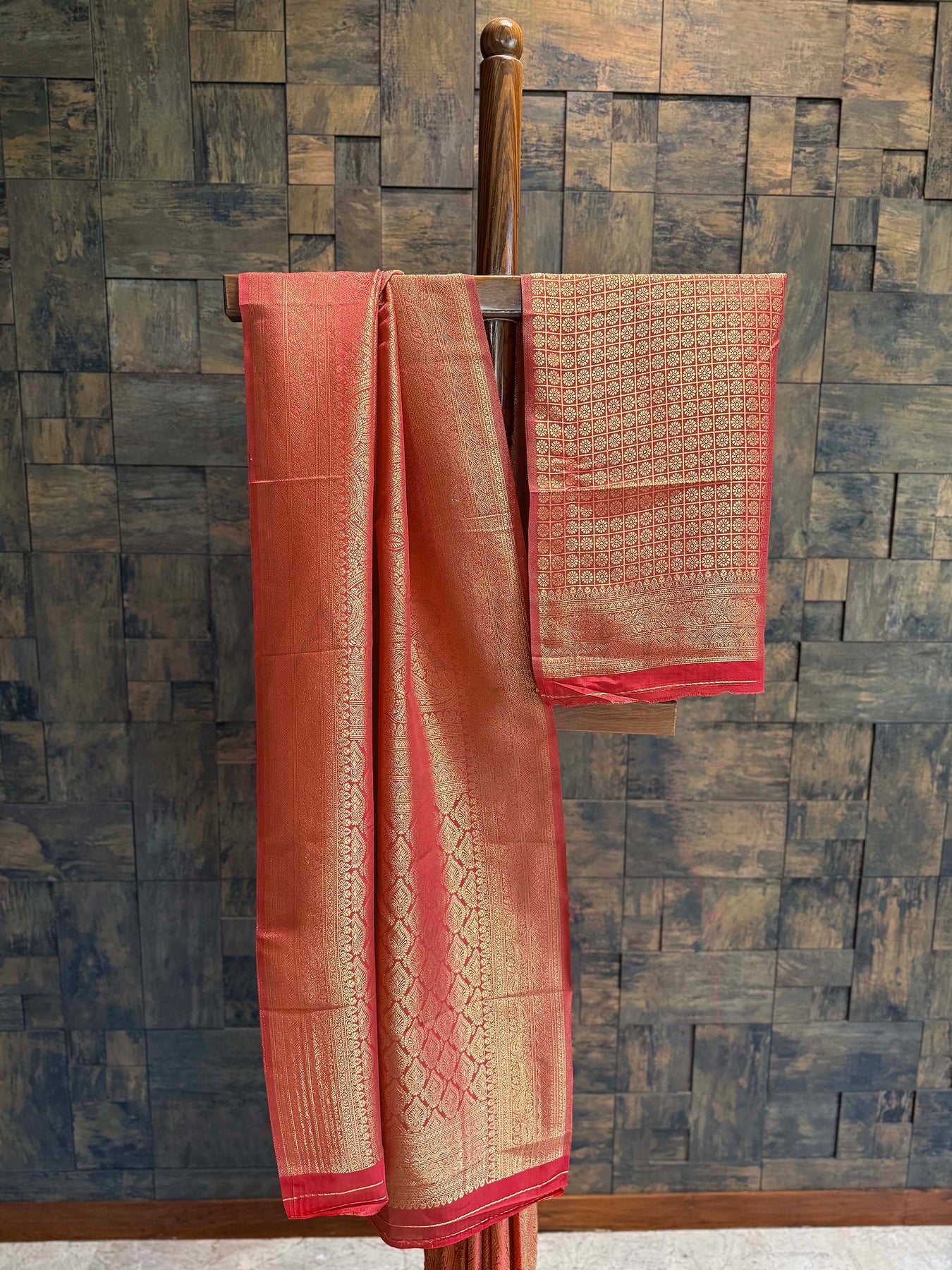 Experience the sophistication and grandeur of South Indian craftsmanship with this Red Golden Zari Kanjivaram Silk Saree, crafted in luxurious art silk with an opulent glossy finish. The saree features an exquisite interplay of deep crimson red and antique gold zari, giving it a royal charm suited for high-end traditional wear. The body showcases dense floral vines, paisley motifs, and geometric lattices woven in shimmering gold zari, reflecting masterful detailing in every inch. The border is rich and commanding, featuring intricate temple-inspired patterns that elevate the entire drape. The pallu carries a radiant golden sheen with elaborate woven designs that highlight the saree’s regal appeal. Paired with a matching crimson red blouse featuring all-over golden zari buttas, this saree is designed for those who value timeless elegance and heritage aesthetics.