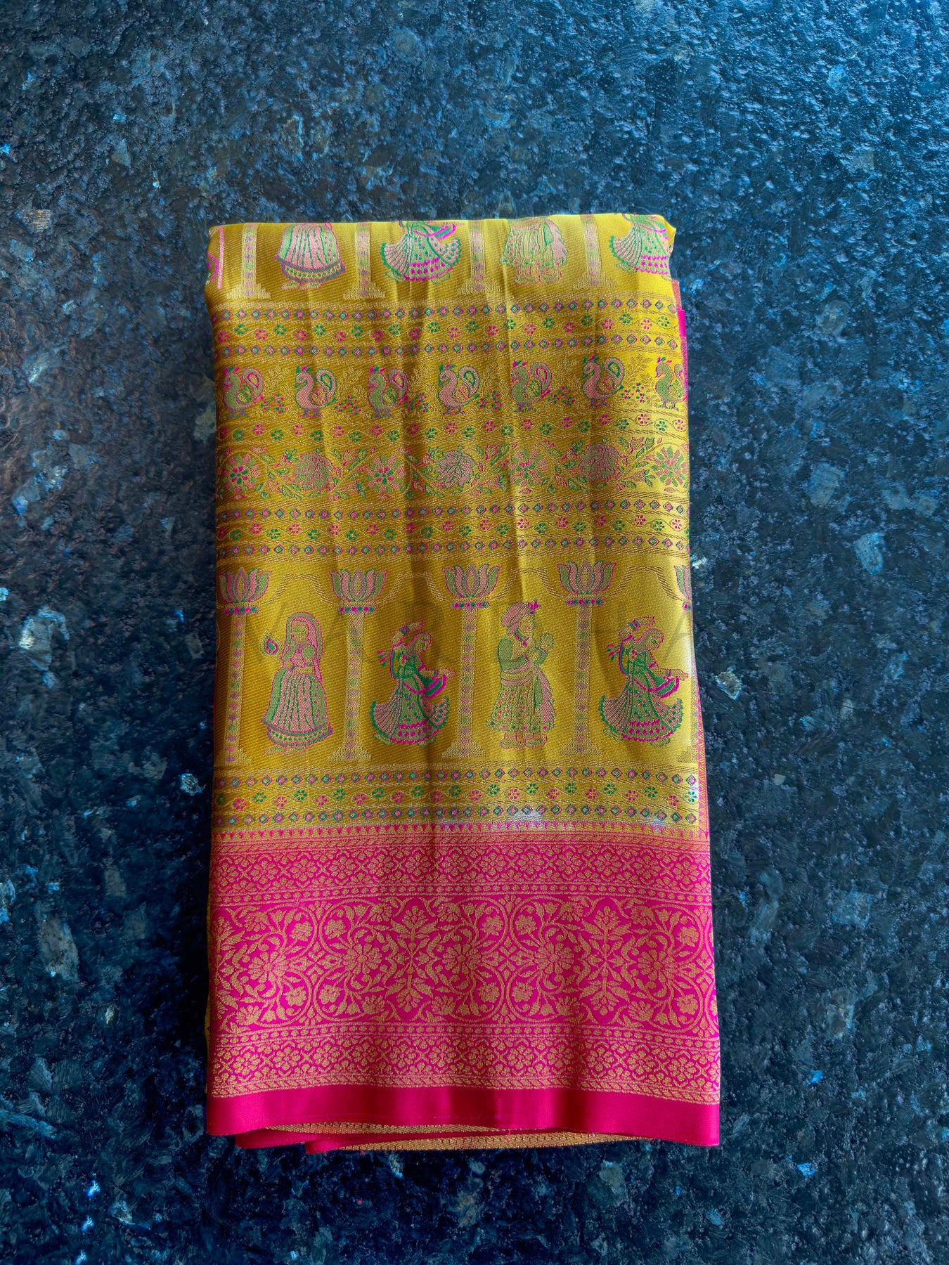 Experience vibrant artistry with this Mustard Yellow Pink Woven Kalamkari Art Silk Saree, crafted for those who appreciate cultural storytelling and traditional weaving. The saree features multicolored woven motifs inspired by Kalamkari heritage including dancing figures, floral vines, temple elements and symbolic peacock forms. The mustard body reflects festive radiance, while the contrasting rani pink border adds richness with intricate golden zari weaving. The pallu takes center stage with an elaborate narrative panel showcasing detailed Kalamkari-style characters and motifs, creating a visually compelling drape that stands out at every celebration. Paired with a rani pink blouse featuring woven buttas and zari accents, this saree brings together vibrance, artistry and traditional craftsmanship.