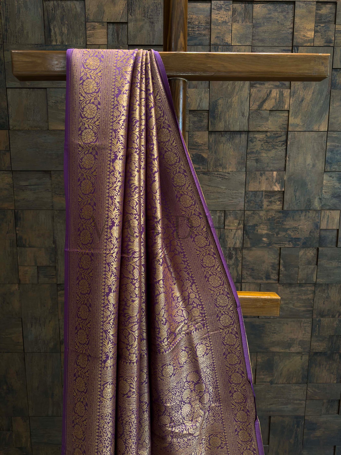 The purple base glows under light while intricate floral jaal unfolds all over. The pallu deepens into dense brocade textures, and the borders carry traditional vine and rosette motifs for a regal frame. The set is completed with a matching purple blouse that features complementary zari borders—perfect for styling with antique-gold jewellery.