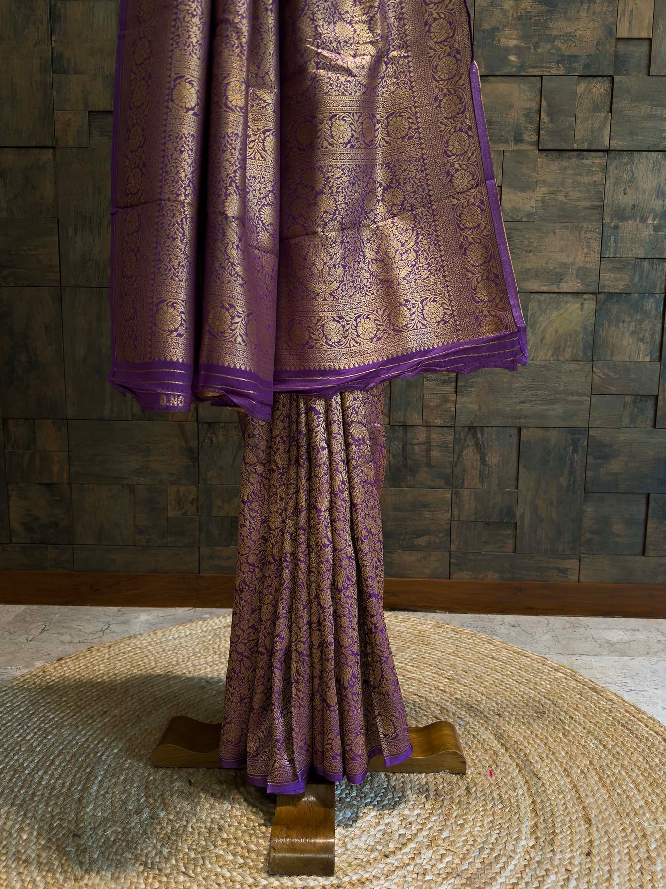 Royal purple Mysore silk saree on stand with gold zari weaving and medium borders