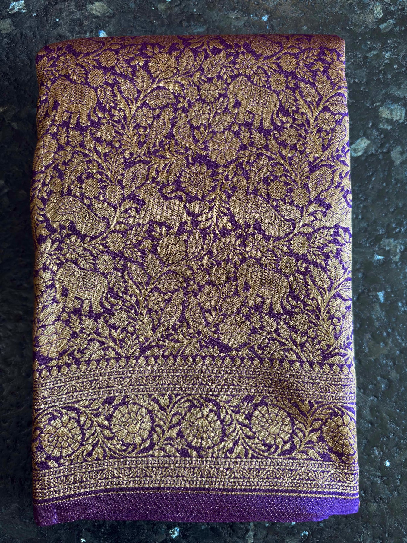 • Work: Traditional jacquard/brocade zari weaving; floral jaal with heritage motifs (elephant & peacock accents on blouse piece)
