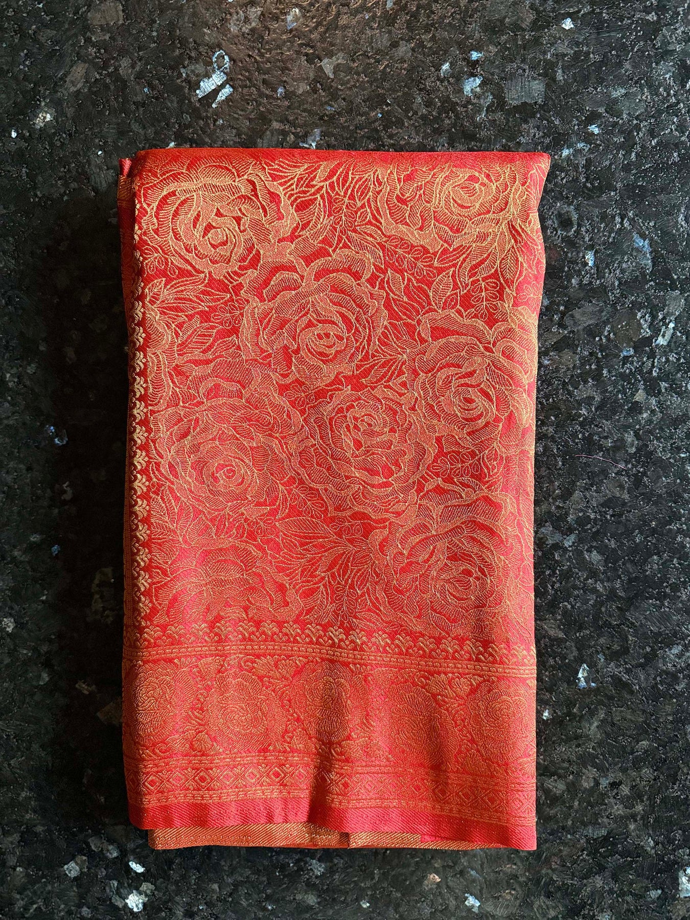Red saree with gold patterns draped over a wooden surface Rich gold zari pallu with traditional floral and geometric motifs