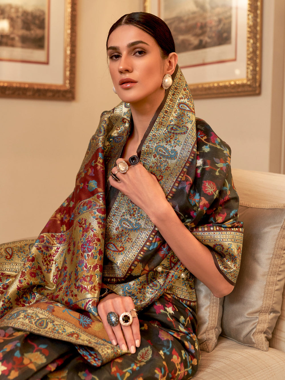 Earthy and elegant, this Cocoa Brown Pashmina Linen Saree exudes timeless charm with a grounded richness. Accented with gold zari and intricate thread work, the deep brown palette offers a sophisticated edge suited for festive wear, cultural functions, or intimate gatherings. A blend of tradition and understated luxury.