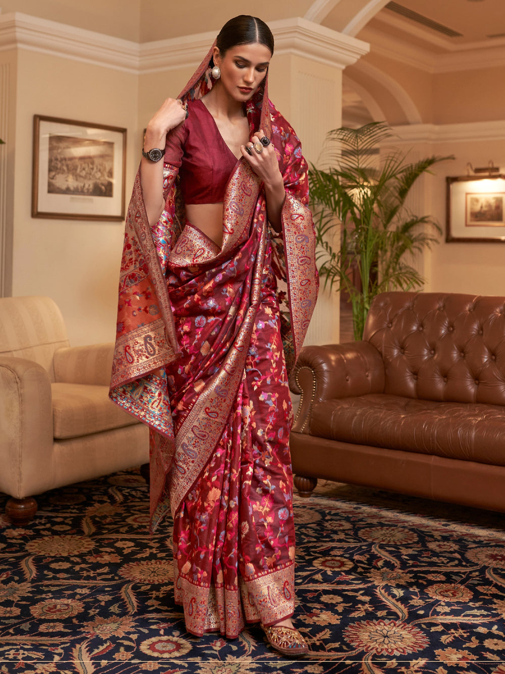 Drape yourself in richness with this Rosewood Maroon Pashmina Linen Saree a striking blend of deep tone and elegant detail. Adorned with gold zari and thread work, the saree brings refined artistry to its bold maroon canvas. Ideal for festive evenings, traditional functions, or refined daywear, it balances comfort with a touch of grandeur.
