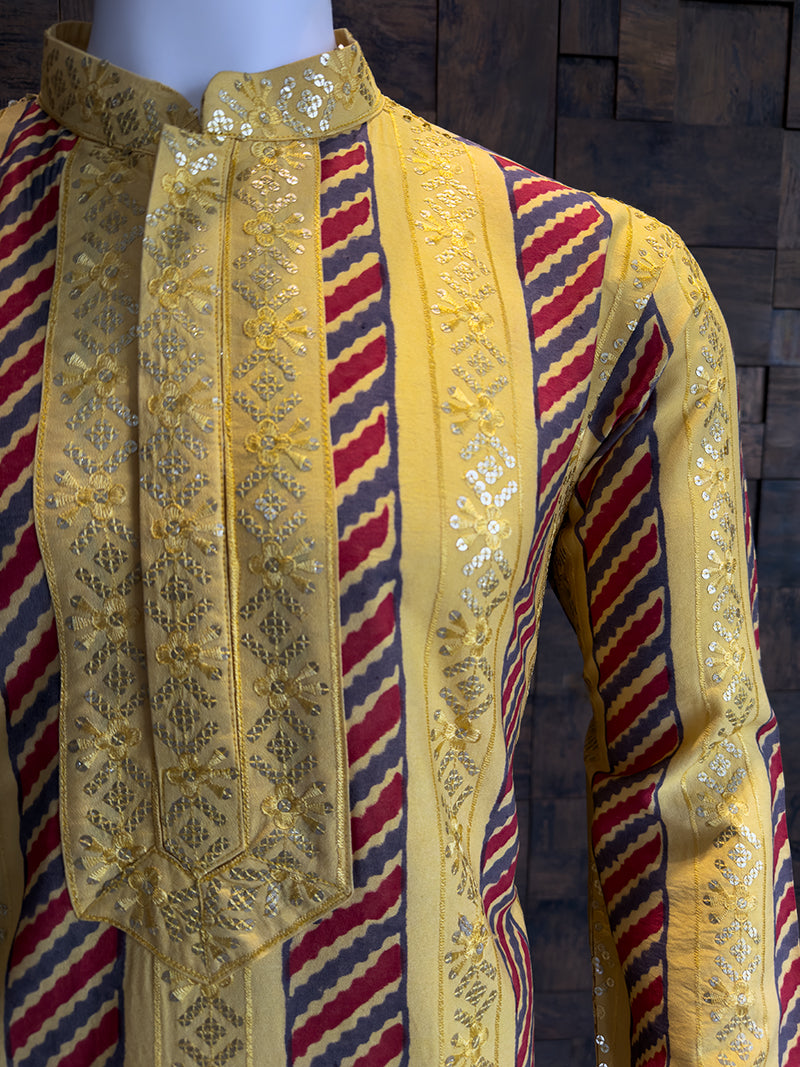 The kurta features a striking Vertical Striped Design. It alternates between Red & Grey printed chevron stripes and bright yellow sections adorned with the exclusive Gold Sequin Embroidery. This combination creates a vibrant, multi-dimensional look.