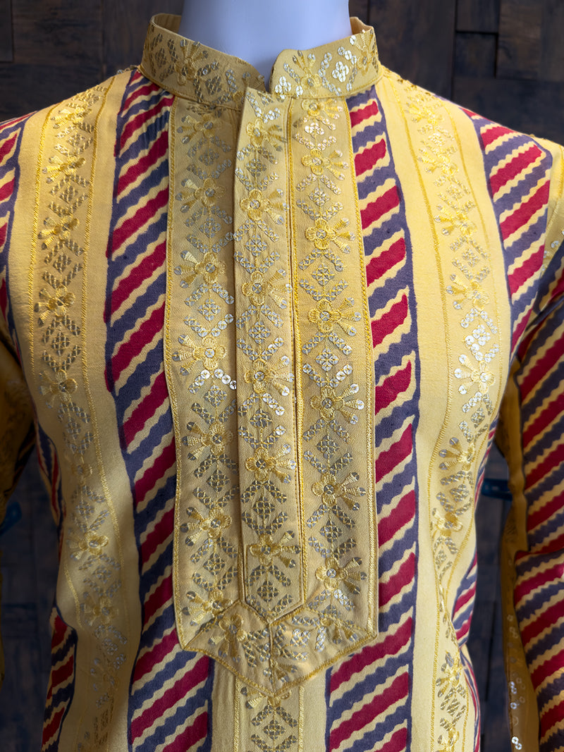 • Kurta Color: Yellow Base with Red & Grey Prints