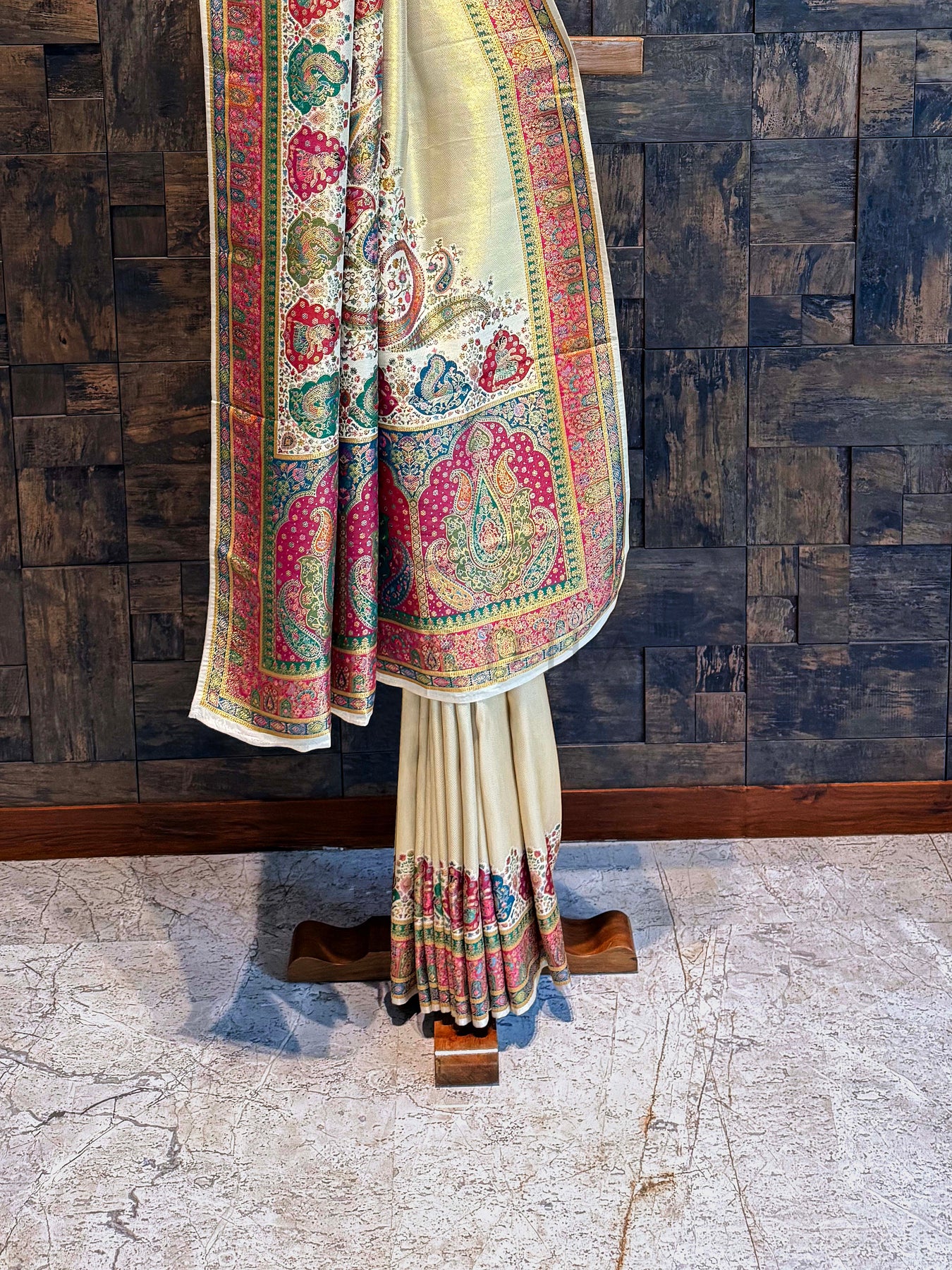 Add a royal canvas of tradition to your wardrobe with this breathtaking Off White Banarasi Katan Art Silk Saree from House of Vardha. The luxurious off-white base is beautifully contrasted by a vibrant multicolor paisley pallu, floral vine motifs, and a temple-inspired zari border.
