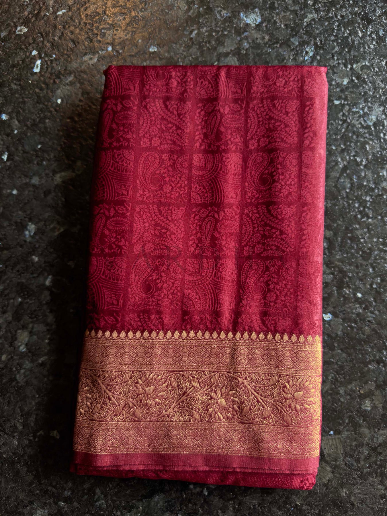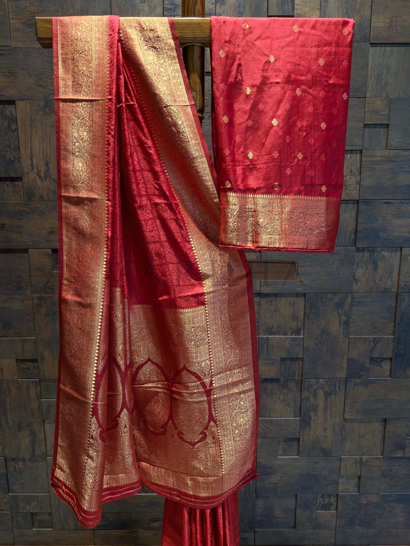 This Red Banarasi Satin Silk Saree brings together the richness of traditional craftsmanship and the beauty of luxurious satin shine. The body features an intricately woven jacquard grid with paisley and floral motifs, giving depth and texture to the drape. The wide golden zari border is crafted with dense floral vines, geometric lattice work, and fine ornamental detailing. The pallu showcases signature Banarasi arch-style motifs filled with meenakari-inspired floral zari artistry. Paired with a matching red blouse adorned with small zari buttas and a coordinating zari border, the saree offers an elegant, heritage-driven silhouette perfect for any grand celebration.