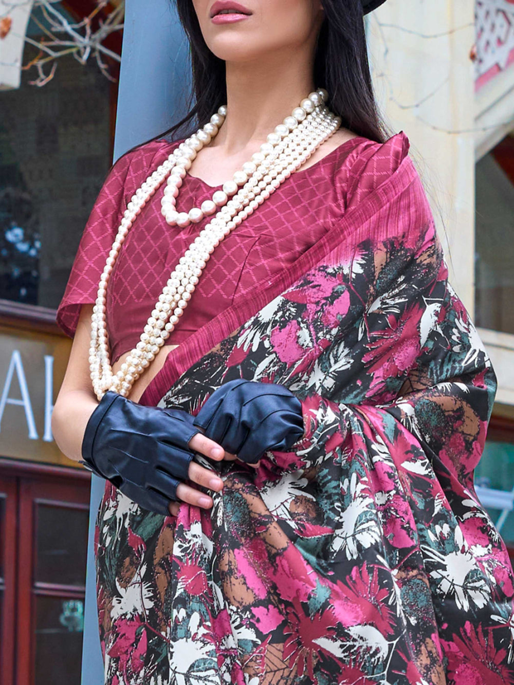 Burgundy Red Printed Satin Crepe Saree with Floral Patterns Modern Ethnic Look