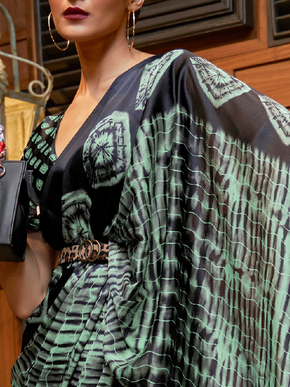 Embrace sophistication with this Licorice-Moss Green Bollywood Saree, crafted from premium Japan Satin Crepe fabric that offers a sleek and fluid drape. Featuring stunning digital print work, this saree boasts a bold Licorice and Moss Green combination, making it a striking choice for festive occasions, evening parties, and cultural celebrations. The matching Licorice-colored blouse completes the look with elegance and class.