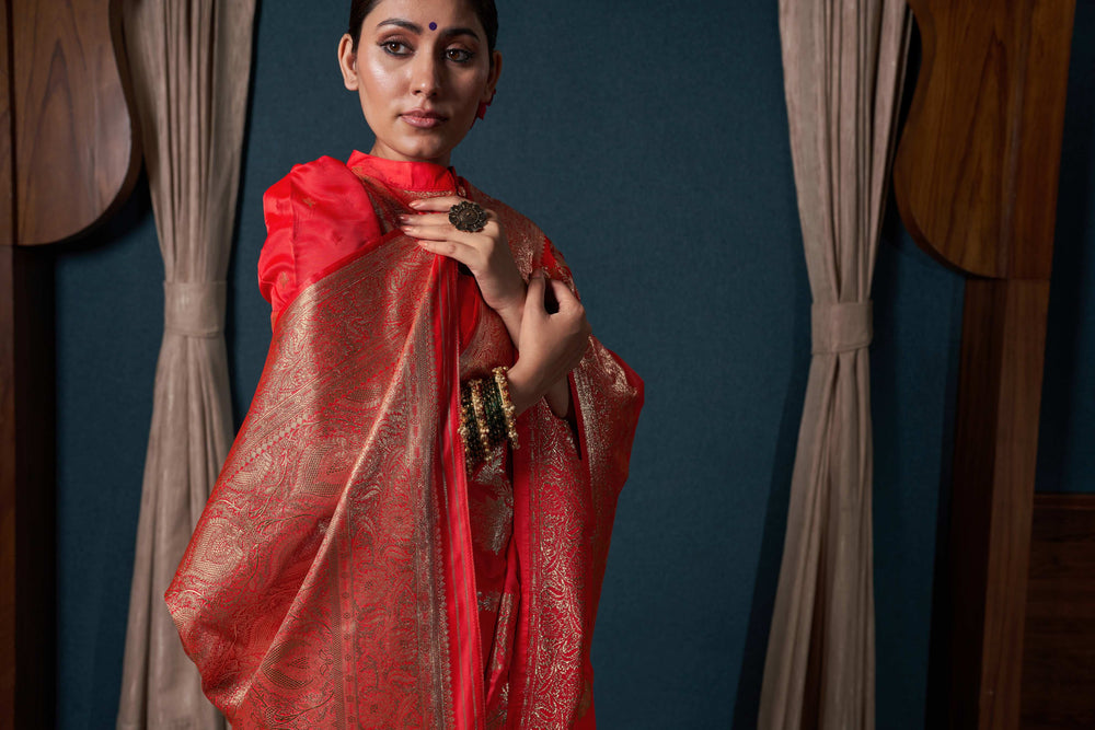 Turn heads with this striking Scarlet Red Banarasi Satin Silk saree, featuring intricate woven gold zari work that adds a touch of regal charm. The bold scarlet hue paired with the luxurious satin silk fabric ensures that this saree stands out in any celebration, making it perfect for weddings, festivals, or special events.