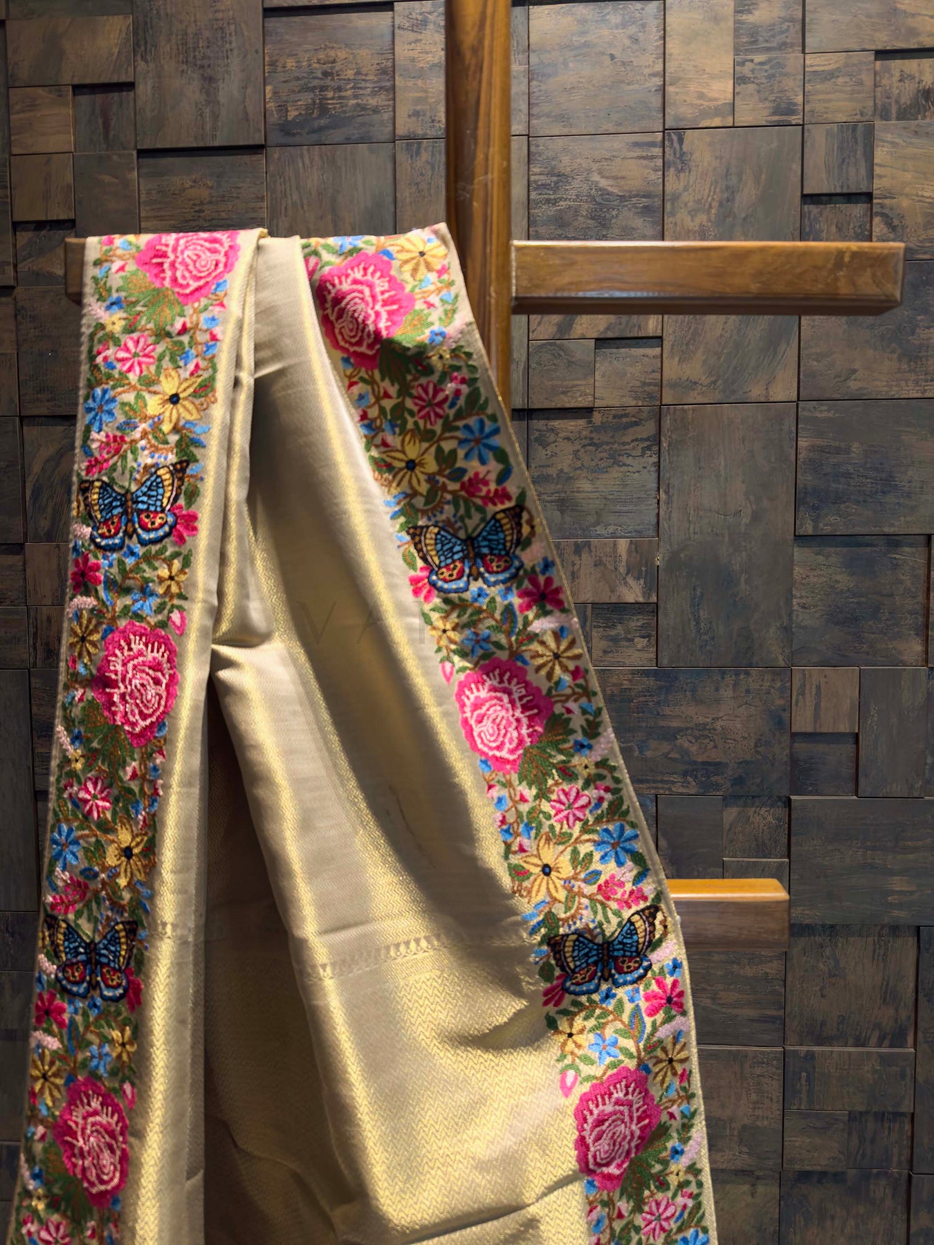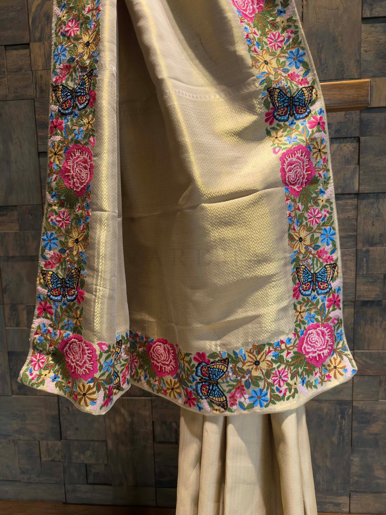 The border pallu is a masterpiece, showcases exclusive Parsi gara hand embroidery on the fabric. The highlight of this ensemble is its enchanting border a vibrant garden brought to life with intricate multi-colored thread embroidery. Blooming pink roses and playful teal butterflies dance along the edges, creating a striking contrast against the serene cream base. Ideal for daytime events, sophisticated brunches, or sangeet ceremonies, this saree offers a graceful drape that feels as luxurious as it looks. It comes with a matching blouse piece adorned with the same delightful floral borders.